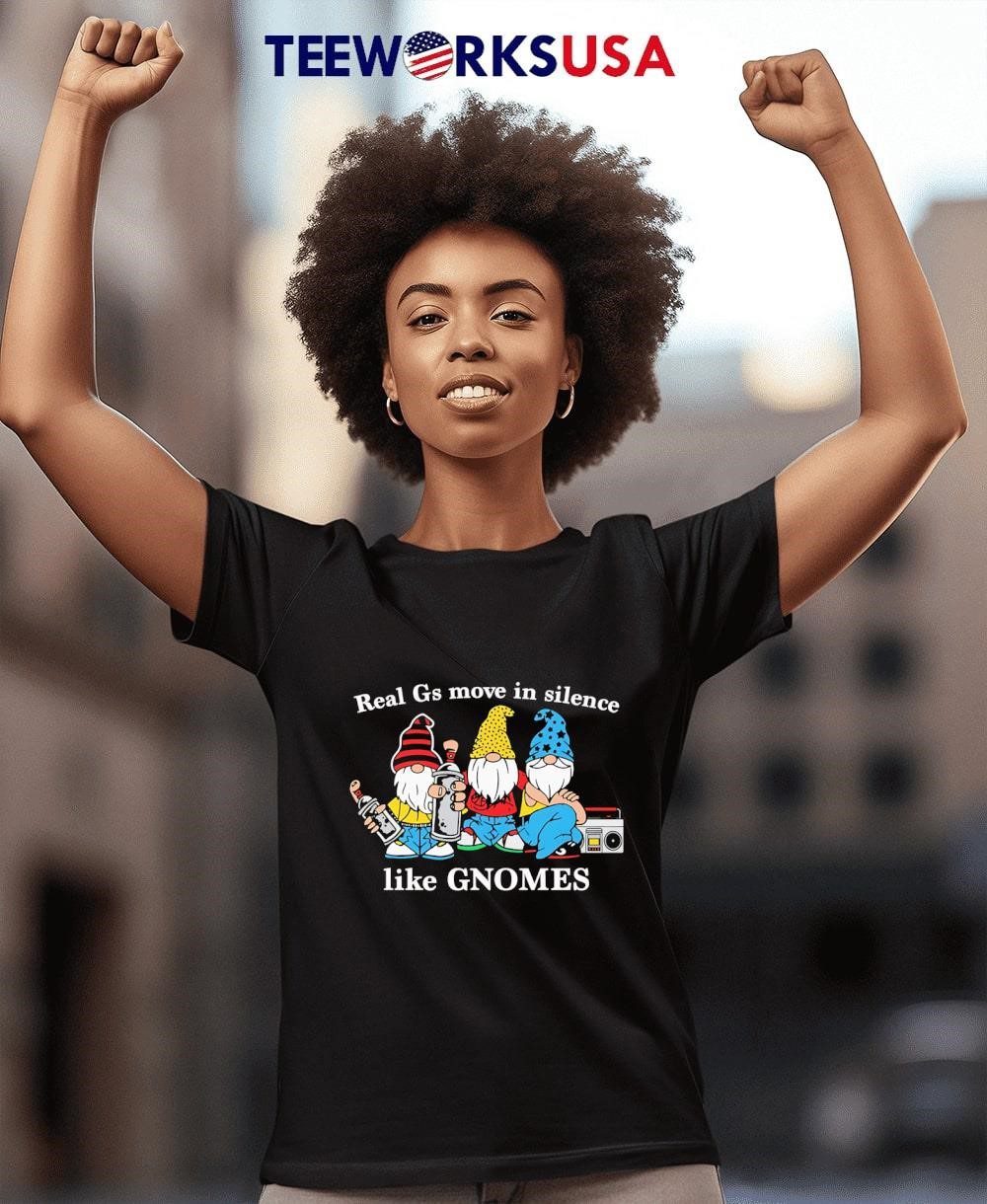 Behind the shirt’s modest façade lies a wealth of wit. The gnome’s playful smirk and the clever phrase “Real G’s Glide in Silence” allude to a humorous nod to those who let deeds speak louder than words. Adorn yourself with this attire, and you’ll exude understated assurance, quietly projecting an air of “I possess knowledge unknown to you.”